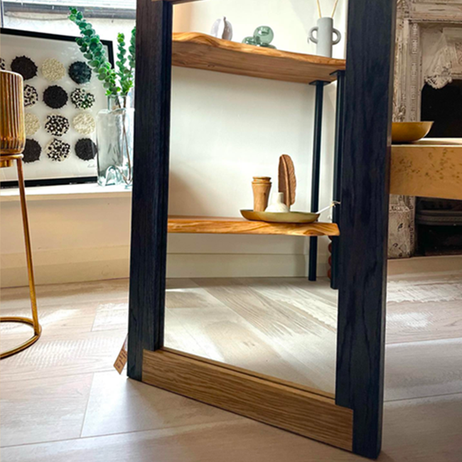 Solid Oak framed mirror, handcrafted in navy and natural wood.